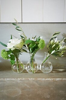 Три восхитительные вазы ручной работы с текстом "Les Petites Fleurs". Изогнутые формы ваз придают цветам игривые формы.