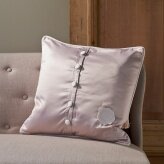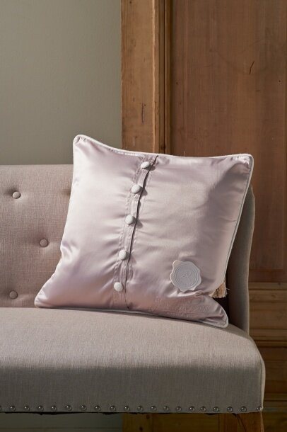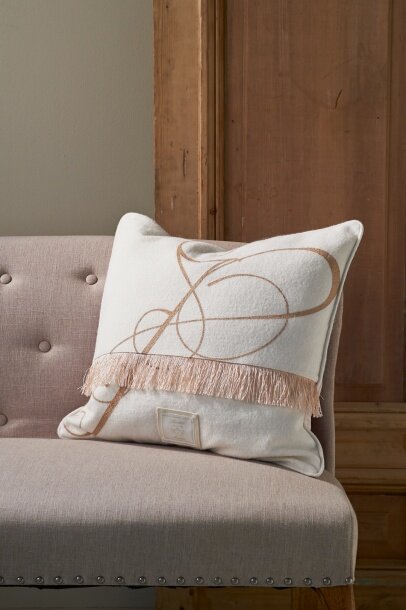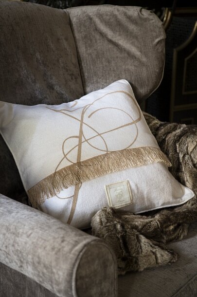Квадратная подушка из элегантной петербургской зимней коллекции. Передняя часть выполнена из мягкого белого войлока с золотистыми оборками по краям. Задняя часть выполнена из бежевой атласной ткани, скрепленной шерстяными кнопками. Изделие украшает оригинальная окантовка.